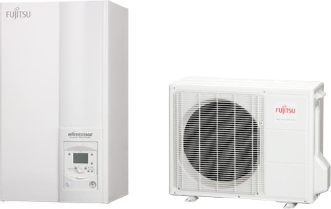 A Fujitsu WaterStage modell egy osztott split rendszerű levegő–víz hőszivattyú, kültéri és beltéri/hidraulikai egységgel.